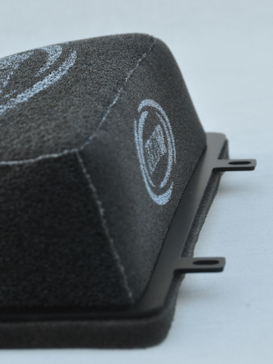 More / bigger surface area means less restriction and better protection, but the real secret of the new WSBK filters is that it uses two different kinds of foam materials. The part where the logo is printed is foam material used for our roadbikes (more dense), the rest is the foam material for the full racefilters (less dense), placed to create the same effect as the splitter-plate on the “HE” & “R” filters.
