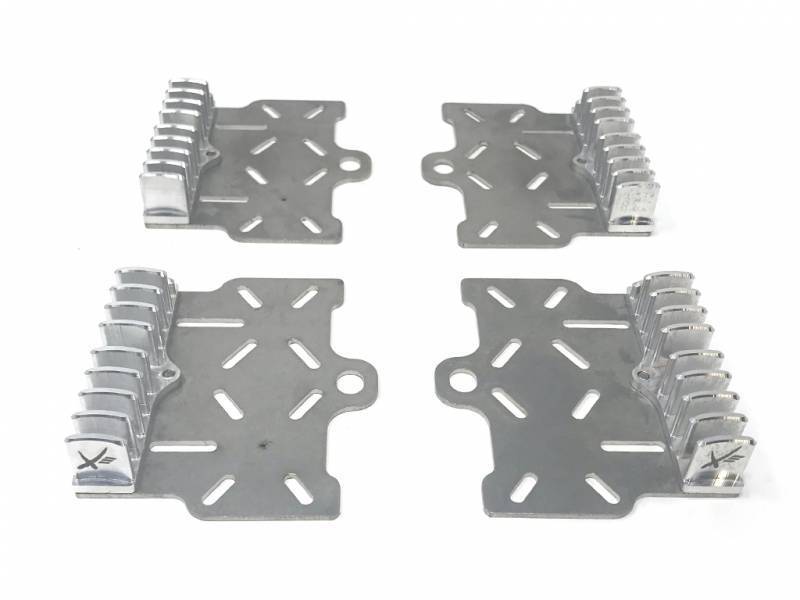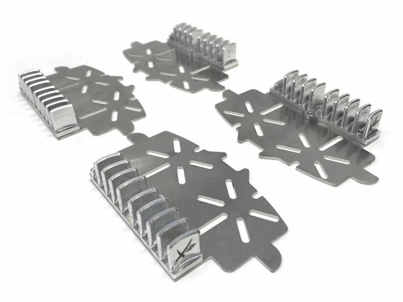 Our heatsinks are made of two elements joined together: A special steel, laser-worked plate, that reduces the hot air chamber taking shape between brake pads and calipers pistons and the proper heatsink, CNC-machined to guarantee the cooling of the steel plate, produced in a special aluminum with a high thermal dissipation capacity.