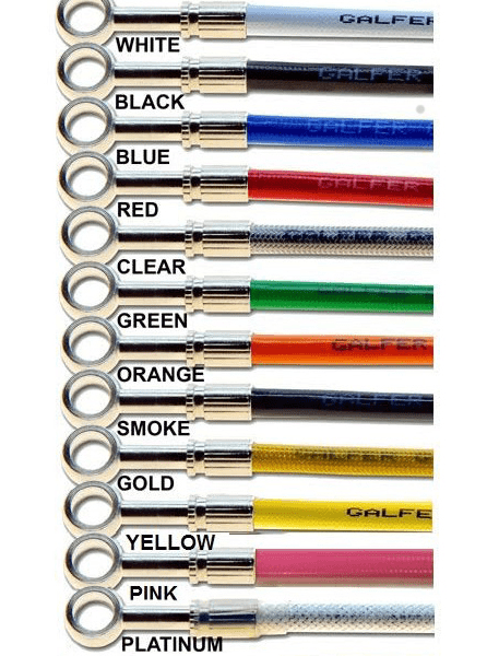 NOTE: Image may vary slightly from actual kit, contact for questions. Aftermarket stainless steel brake lines may look similar, but they are not the same! Every Galfer stainless steel line is made with only DuPont virgin grade PTFE inner core, 64 strand braid and our fittings are probably the most expensive, but highest quality you can find on the planet. These are the same fittings that Ferrari, Lamborghini, and Ducati uses, among a few other high end OEM’s. Our lines come with a lifetime warranty. Not because we make them at a low cost and can afford to easily ship out replacements, but because they are made extremely well. We also include all mounting components, extra washers, line end labeling, and bike specific installations, some with DVD’s. R&D and manufacturing is here in the US, along with our customer accessible tech support team. Line color available includes clear, black, blue, green, gold, red, platinum, orange, yellow, white and smoke. Pre-positioned Banjo fittings available in black, silver, gold, red and blue. Race team tested and proven!