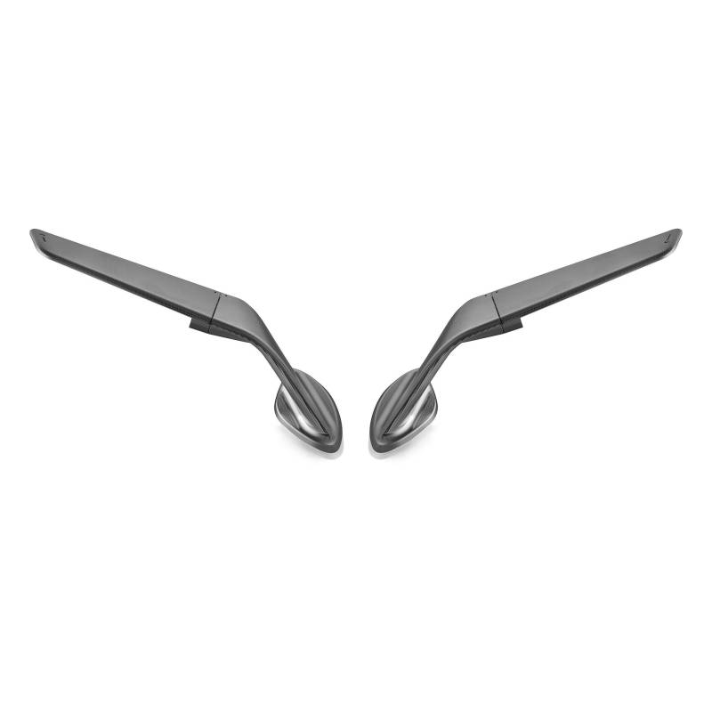 From racing experience and aeronautical inspiration comes the Rizoma Stealth Mirror. Specifically designed for sport bikes. It consists of a fixed part, which fits directly to the fairing, and a movable part, which acts as a mirror glass holder. Thanks to a rotating system the two parts get aligned so in the closed position the mirror becomes an aerodynamic foil Wing!