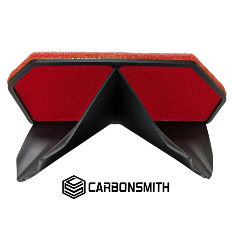 THE CARBONSMITH 2017+ SUZUKI GSX-R 1000 R.A.M. (REDIRECTED AIR MANAGEMENT) AIR FILTER WAS DESIGNED TO DIRECT THE AIR INSIDE OF THE AIRBOX MORE EFFICIENTLY AND TO ELIMINATE TURBULANCE THAT IS CREATED FROM THE HEAD ON COLLISION OF AIR GENERATED FROM THE NORMAL AIRBOX CONFIGURATION. THIS RESULTS IN MORE EFFICIENT AND HIGHER VELOCITY AIRFLOW TO THE THROTTLE BODIES AT HIGH SPEED. COMPARED TO OTHER RACING AIR FILTERS, THE CARBONSMITH R.A.M. AIR FILTER RESULTED IN AN AVERAGE OF 7/10TH OF A SECOND QUICKER 40-140 MPH TIMES AND SHOWED AN AVERAGE OF +1HP ON THE DYNO.